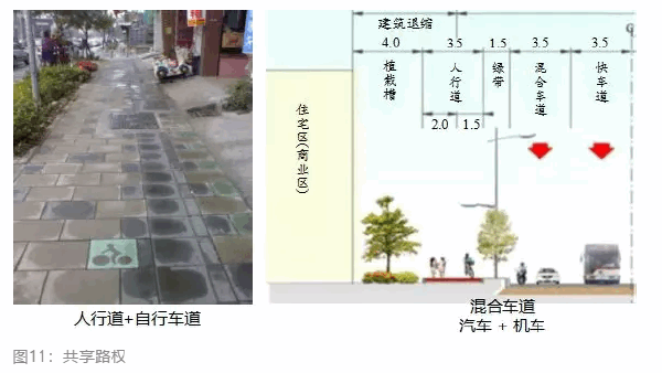 共享路权也叫共用路权。如图11中的道路,左图中的道路既是人行道也是自行车道,右图中间是混合车道,汽车和摩托车都可以行驶。在共用路权的情况下,需要大家互相礼让。