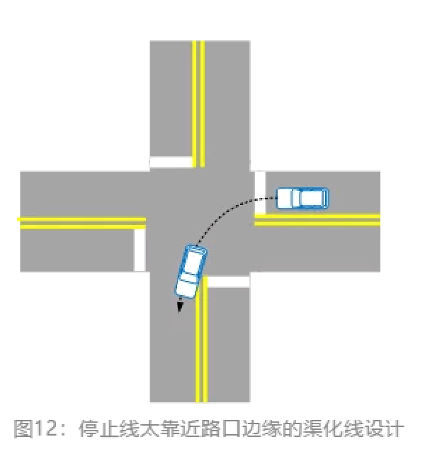路权实际上和交通工程、交通管理是结合在一起的,交通工程设计不好会造成路权不明,因此,交通工程师要有路权理念。如图12所示,在交叉路口,如果驾驶人提前左转,一定会压双黄线,如果因此发生交通事故,驾驶人要承担相应责任;但是,如果一辆车在交叉路口正常左转也会压黄线,说明此处的交通工程设计是存在问题的,如停止线太靠近路口边缘,车辆正常转弯时容易压双黄线。