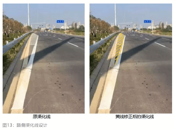 路权与交通设施,尤其是标志标线是一体的。正常行驶的车辆突然左转时,一定是有角度的。图13中的原渠化线为折线,驾驶人难以明白其驾驶任务,无法行使其路权。将原渠化线修正为图13中右图所示的黄线,驾驶人可在其路权范围内轻松完成驾驶动作。