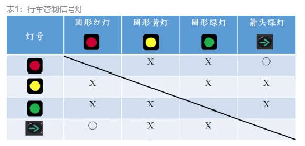 表1表示哪些行车管制信号灯不能同时显示。圆形绿灯与圆形黄灯、圆形红灯与圆形黄灯、圆形红灯与圆形绿灯不能同时亮,圆形绿灯与箭头绿灯也不能同时亮,因为圆形绿灯代表车辆可以直行,也可以右转、左转,此时箭头绿灯是多余的。