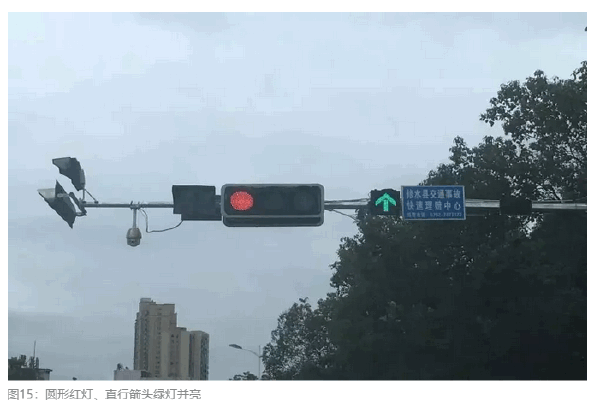 图15中,圆形红灯与直行箭头绿灯同时亮起,到底车辆可不可以行驶呢?这就让驾驶人产生困惑和犹豫。