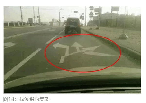 看到图18中的道路标线,驾驶人该怎么办呢?标线指向太复杂,不符合人因工程原理,也违背驾驶任务理论。