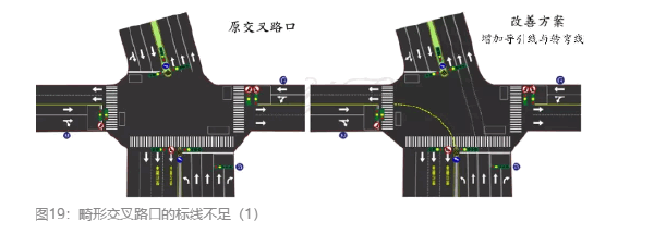 畸形交叉路口的标线不足也是造成驾驶人困惑的原因之一。如果道路上存在标线含义不清的问题,怎么办?如图19中的交叉路口,如果增加一条路心对路心的黄色左转导向线,驾驶人就会清楚该怎么左转,而且导向线、转弯线应画在驾驶人左侧,让驾驶人知道应该靠左转车道的左边。