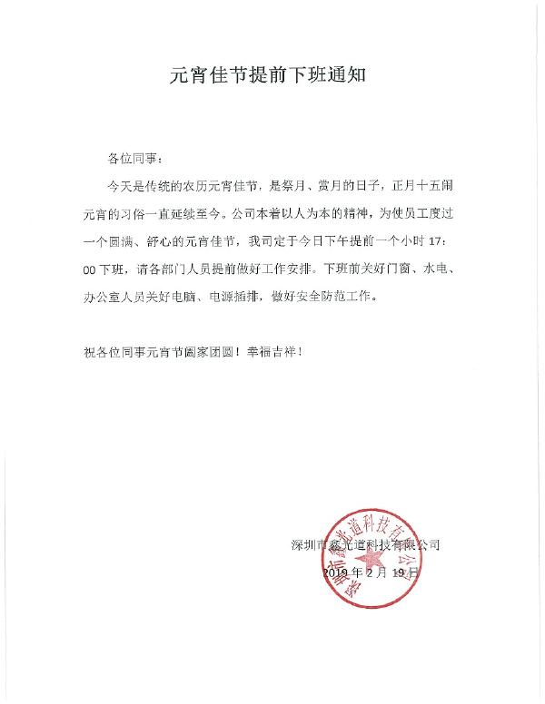 2019年元宵佳节提前下班通知