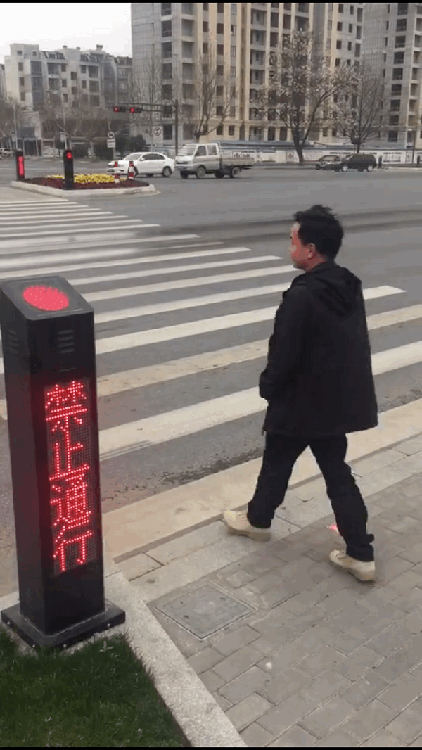 “路口危险,请注意来往车辆”当行人进入过街待行区内,系统会自动启动照明灯光,行人过街标志牌开始闪烁,斑马线两侧道钉开始闪光,提示行车注意礼让行人。