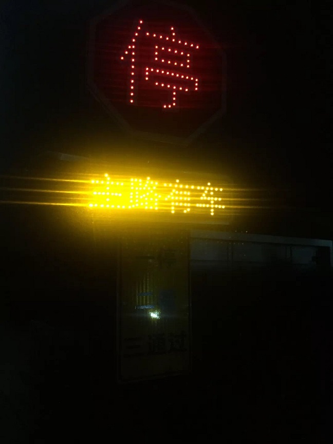 “主路有车,进入请注意安全”当行人车辆即将进入主路,如果主路有车,让行标志就会点亮,语音播报开启。同时,太阳能菱形道钉与照明灯光也会亮起。