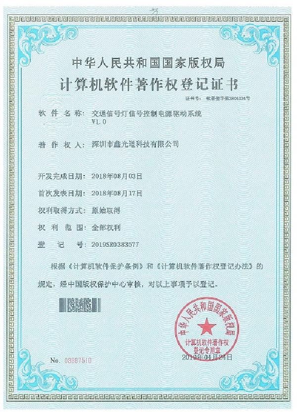 中华人民共和国国家版权局计算机软件著作权登记证书 软件名称:交通信号灯信号控制电源驱动系统V1.0 著作权人:太阳成集团tyc7111cc,太阳集团tyc4633,太阳集团tyc9728 开发完成日期:2018年8月03日 首次发表日期:2018年8月17日 权利取得方式:原始权利 权利范围:全部权利 登记号:2019SR0383577 根据《计算机软件保护条例》和《计算机软件著作权登记办法》的规定,经中国版权保护中心审核,对以上事项予以登记