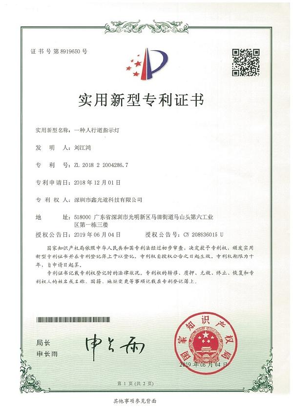 实用新型专利证书 实用新型名称:一种人行道指示灯 发明人:刘江鸿 专利号:ZL 2018 2 2004286.7 专利申请日:2018年12月01日 专利权人:太阳成集团tyc7111cc,太阳集团tyc4633,太阳集团tyc9728 授权公告日:2019年06月04日 授权公告号:CN 208936015 U