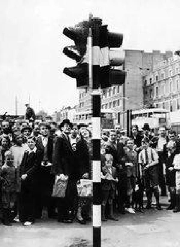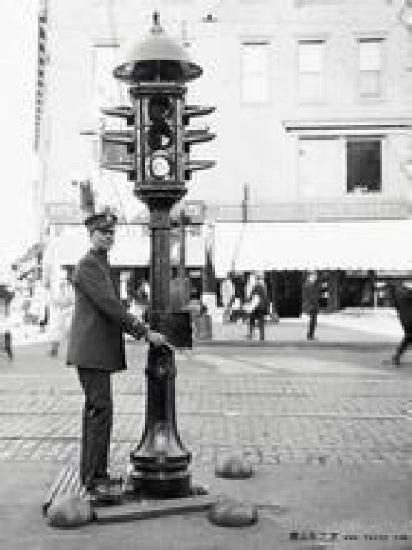 1914年,电气启动的红绿灯出现在美国。这种红绿灯由红绿黄三色圆形的投光器组成,安装在纽约市5号大街的一座高塔上。红灯亮表示"停止",绿灯亮表示"通行"。