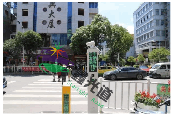 “非灯控路口”行人过街设施,包括机动车信号和行人过街信号两个部分。在斑马线两侧的路口处,设置装有两个黄色的语音提示桩和一个设有“行人过街按钮”的路段式行人过街申请系统。分别位于苍山路西窑菜场口、苍山路苍宝巷口、泰安路集市巷口、关平路鸳浦街口、人民路振兴街口、滨海大道洱海公园北门口、泰安桥南闸道口、兴国路口、大关邑菜场口。