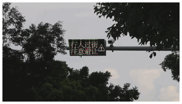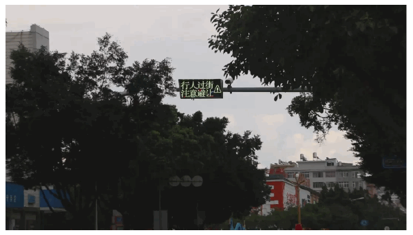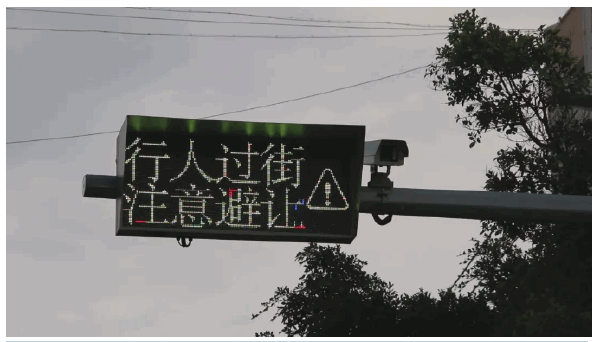 机动车道诱导屏显示“行人过街,注意避让”黄颜色字样及三角标志闪烁警示提示,提示机动车保持减速通行。