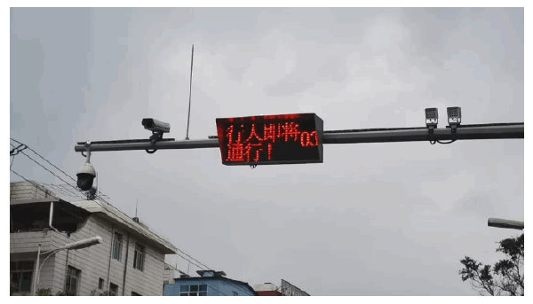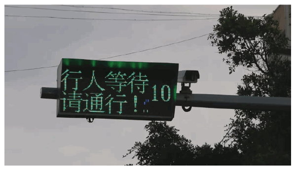 行人提示屏显示“车辆等候,安全通行”文字,并同步发出“车辆等候,请通行”的语音提示,同时马上开始倒计时。