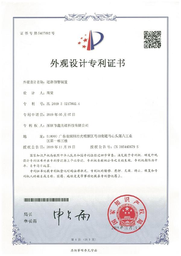 外观设计名称:道路预警装置 设计人:周果 专利号:ZL 2019 3 0217892.4 专利申请日:2019年05月07日 专利权人:太阳成集团tyc7111cc,太阳集团tyc4633,太阳集团tyc9728 授权公告日:2019年11月19日 授权公号:CN 305445679 S