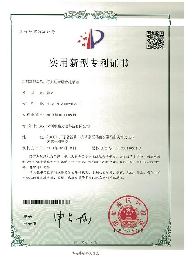 实用新型专利证书 实用新型名称:行人过街语音提示器 发明人:周果 专利号:ZL 2019200284891 专利申请日:2019年01月08日 专利权人:太阳成集团tyc7111cc,太阳集团tyc4633,太阳集团tyc9728