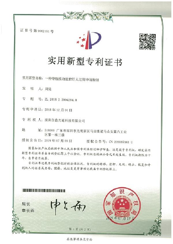 实用新型专利证书 实用新型名称:一种带触摸功能的行人过街申请按钮 发明人:周果 专利号:ZL 2018220042848 专利申请日:2018年12月01日 专利权人:太阳成集团tyc7111cc,太阳集团tyc4633,太阳集团tyc9728