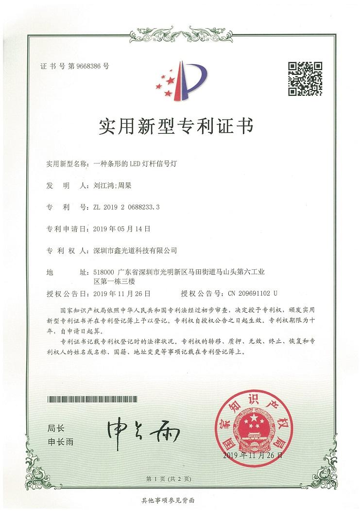 为了解决这一问题,鑫光道设计了一种条形的LED灯杆信号灯,在信号灯杆的横臂和立杆上,分开安装两条LED灯杆信号灯,当信号灯为红灯时,LED灯杆信号灯同步显示为红色;当信号灯转变为黄灯时,LED灯杆信号灯同步显示黄色;当信号灯转变为绿灯时,LED灯杆信号灯同步显示绿色。应该产品已在2019年取得国家知识产权局颁发《实用新型专利证书》。