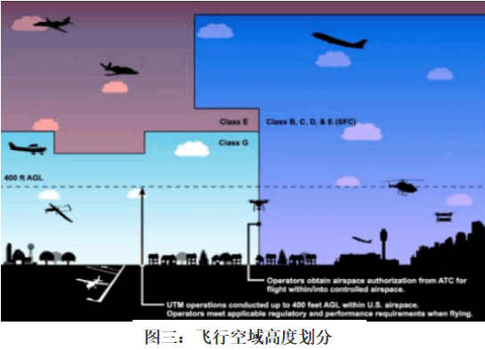 图三为空域划分,蓝色为混合空管空域(机场、城市附近),紫色为传统航空器飞行高度,浅蓝色为无人机飞行高度。