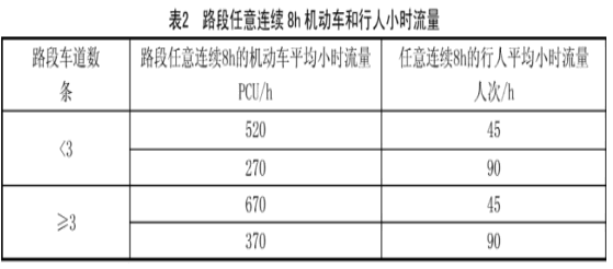 2、路段任意连续8H 机动车和行人平均小时流量超过表2所规定数值时,应设置人行横道信号灯和相应的机动车信号灯;