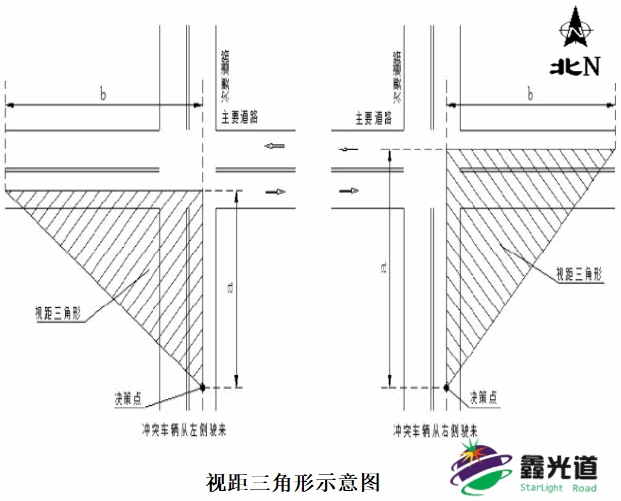 根据GB14886-2016《道路交通信号灯设置与安装规范》对安全停车视距三角形定义为:平面交叉路口处,以任一进口道的最外侧的车道中线与右侧相交道路进口道最内侧的车道中线的交点为顶点,沿两条车道中线按其限制车速行驶所需要的安全停车视距长度为两边,所组成的三角形区域。