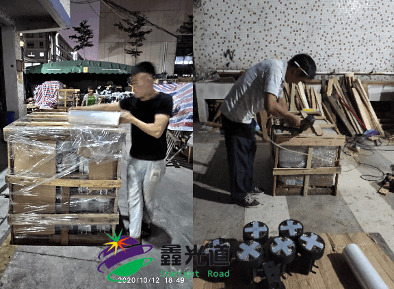 为了急客户所急、想客户所想、保质保量、按期交付。鑫光道同仁们抢时间、报节点,昨晚2020/10/12连夜将20个路口配套LED发光斑马线系列产品装箱打木架,做足运输保护工作。虽然拼尽全力去抢时间,今天还是抢不过“浪卡”带来的风雨啊!