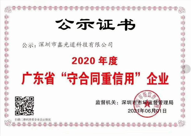 以此为契机,鑫光道将进一步发扬“守合同重信用”精神,不忘初心,提高企业信誉,通过自主研发、自主创新,提升产品服务质量,用实际行动践行诚信理念。