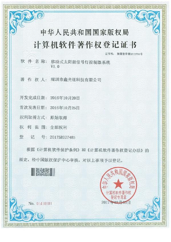 鑫光道软件著作权证书--移动式太阳能信号灯控制器系统V1.0