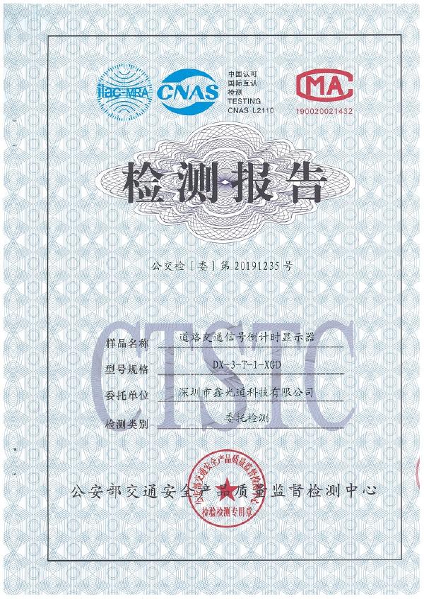 检测报告 样品名称:道路交通信号倒计时显示器 型号规格:DX-3-T-1-XGD 委托单位:太阳成集团tyc7111cc,太阳集团tyc4633,太阳集团tyc9728 检测类别:委托检测 公安部交通安全产品质量监督检测中心