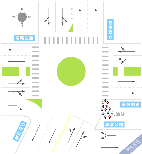 富强三路民主立交桥底路口是十字环岛路口,连通文明公路和自由西路两条重要道路。该环岛路口只有西进口设右转渠化;