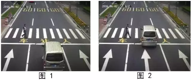 图1能反映机动车未进入人行横道区域并能清晰辨别机动车特征,以及人行横道上行人的通行方向;