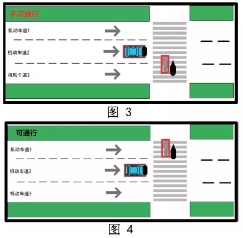 图2能反映图1中同一机动车进入了人行横道区域并阻挡了行人通行。