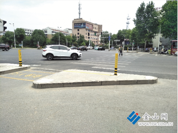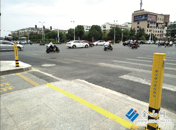 昨天上午11时许,记者来到东吴路和梦溪路十字路口,看到每个路口的2个方向,分别在路边的隔离带上,安装了2根长约15厘米,宽约10厘米,高约1米的黄柱子,正对行人的方向,各有一排指示灯。这些指示灯与交通信号灯一致。