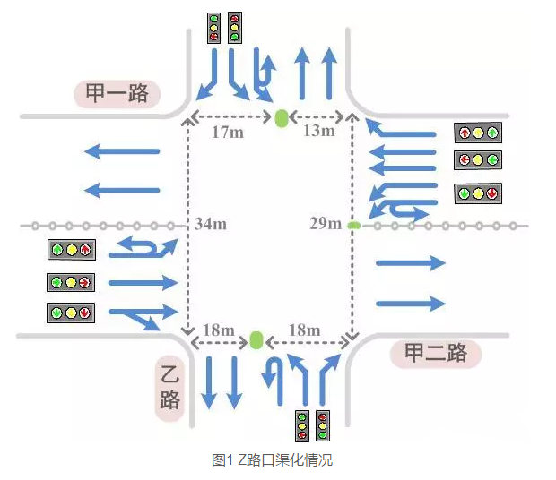 Z路口是甲路与乙路这两条主干道的交叉路口。甲路的日交通量为13000辆(双向),乙路的日交通量为34000辆(双向)。Z路口位于繁华路段,商铺众多,且东边有公 园, 人流量大,该路口的交通压力非常大!