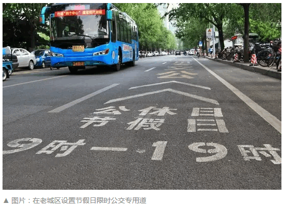 为倡导绿色低碳出行理念,改善城市人居环境和交通状况,于2014年启动了《济南市道路交通管理政策与对策》和《济南护城河片区节假日交通组织研究》两项研究,确定了以“高效交通、绿色交通、人文交通和品质交通”为目标的“公交+慢行”慢城建设模式。借助“慢生活街区”建设,在老城区(护城河以内道路)重新实施路权分配,周末及节假日期间将双向四车道的明湖路、黑西路、黑北路外侧车道设置为限时(早9点—晚19点)公交专用道,将双向六车道的趵北路的中央车道设置为双向限时(早9点—晚19点)公交专用道,将外侧车道设置为双向限时非机动车专用道,目前已形成常态化管理,倡导绿色低碳出行,人车拥挤状况明显改善。