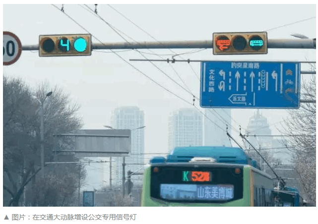 在交通大动脉增设公交专用信号灯,实现公交的信号提前放行。兼顾社会车辆,实行公交站间的公交车辆绿波优先控制,进一步提高公交通行效率。