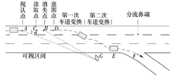 驾驶人的实际读取点C只要在可视区间AB上,就能保证从容读取标志的信息。在车辆从C点行至D点的过程中,驾驶人做出是否驶离的决策并做好准备,只要存在变道的安全间隙就开始变道行为。