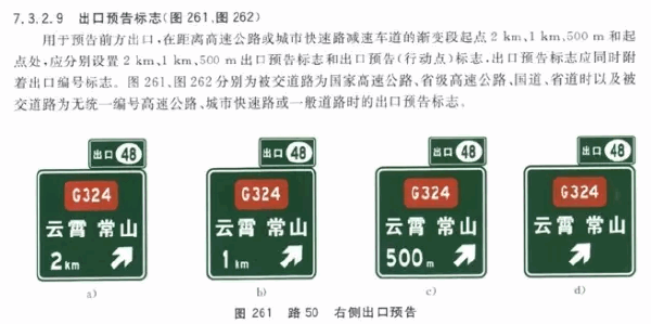 按照国内标准,高速公路或者快速路的出口预告有四次,除此之外还有一次分流端头预告。为什么这样设置,是基于一种观点:如果不反复提醒,驾驶人总会遗忘一些重要信息。